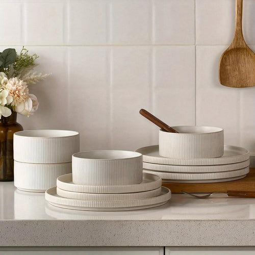 Plates, bowls & serving dishes—one set for daily meals & gatherings.